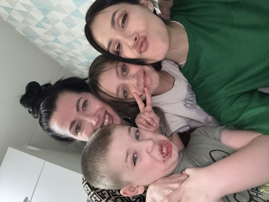 This image depicts four individuals posing for a close-up indoor photograph in Votkinsk, Russia. The scene features two adults and two children. In the upper-left quadrant, an adult female with dark hair styled in a high bun, light-colored eyes, and a patterned garment featuring a dark geometric design smiles broadly, revealing her teeth. To her lower-left, a young boy with light short hair and light-colored eyes makes an exaggerated facial expression with his lips puckered and tongue visible, his right arm resting on the shoulder of the child next to him. In the center-right, a young girl with dark hair and light-colored eyes smiles while making a peace sign with the fingers of her right hand; she wears a white t-shirt with a faint graphic including the word "GOODNESS". In the lower-right quadrant, a second adult female with dark hair pulled back, dark eyes accentuated with winged eyeliner, and a dark green long-sleeved shirt pouts her lips. She wears a white beaded necklace. Her left arm is positioned behind the young girl. The background on the left consists of white cabinetry or wall panels, while the background on the right features wallpaper with a geometric pattern of triangles or diamonds in shades of light blue, white, and grey.