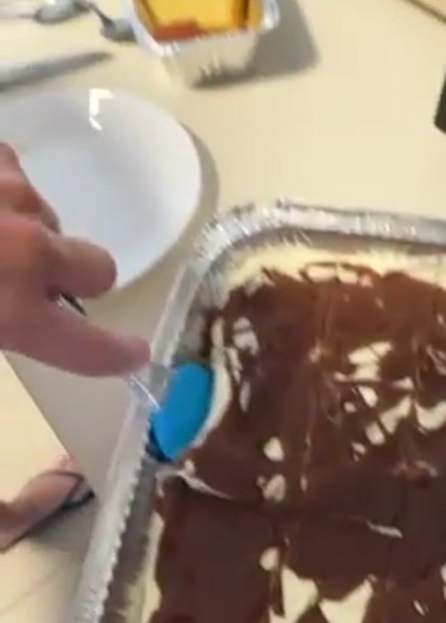 person using a blue and silver spatula to remove a piece of chocolate-covered cake from a foil pan. The person places the cake on a white plate. There is a loaf of bread or cake in a foil pan to the side of the plate. The scene takes place on a light-colored countertop in what appears to be a kitchen. A person wearing flip-flops is visible in the periphery.