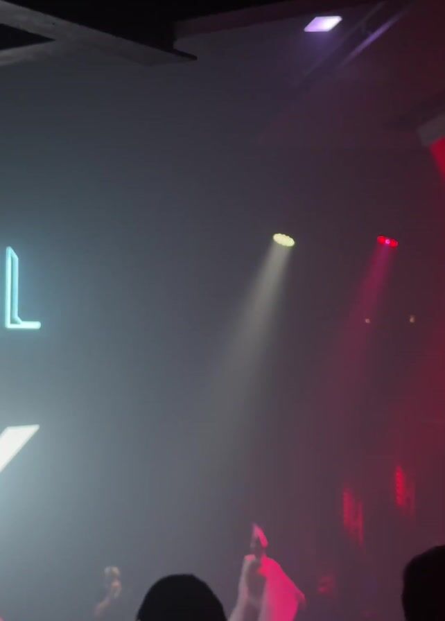 A dark, smoky nightclub scene unfolds. The focus is on a figure, likely a performer, illuminated on stage by both a bright white spotlight and red stage lighting. The performer is silhouetted against the light, and they appear to be wearing white attire with what could be wings or flowing fabric. In the foreground, silhouetted heads of audience members can be seen. A man wearing a baseball cap is visible in the center of the frame. The club's branding, featuring a neon "L" and other illuminated elements, is partially visible on the left. There are moments of brighter red light shooting up from the stage toward the ceiling. The audio includes music and a voice hyping up the crowd.