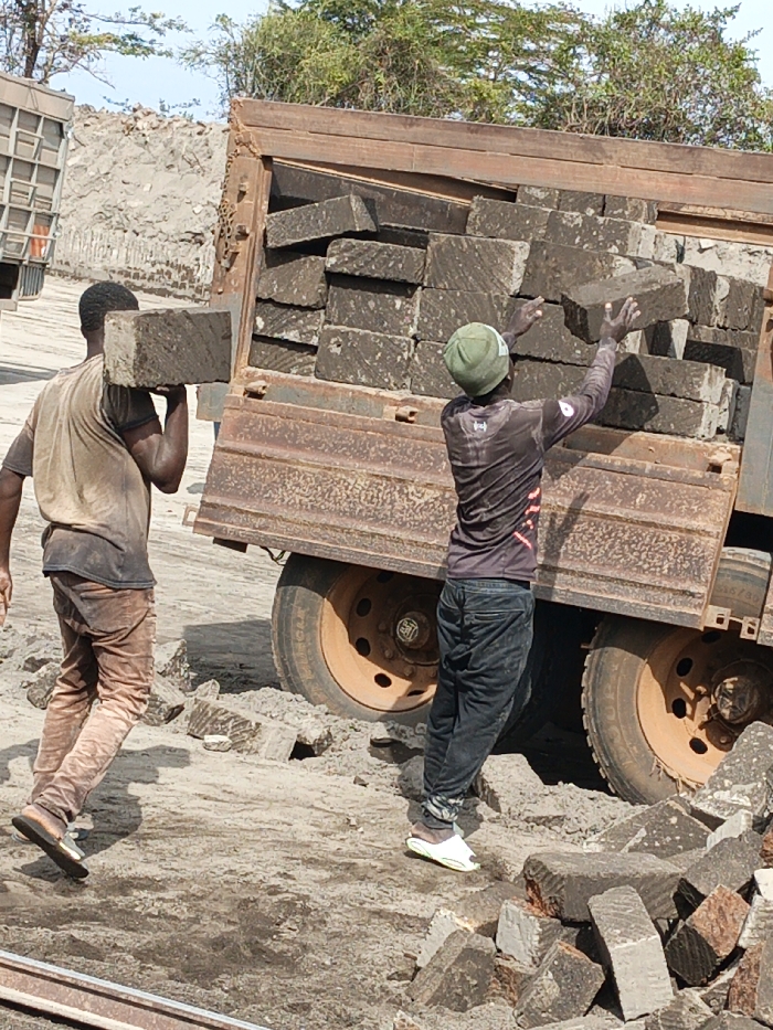 The image depicts an outdoor scene in Kyeleni ward, Kenya, featuring two adult males engaged in manual labor involving stone blocks and a truck. In the foreground, a dark-skinned male wearing a dirty tan t-shirt and matching pants walks from left to right, carrying a large, rectangular dark gray stone block on his right shoulder. Behind him and to the right, a second dark-skinned male, wearing a dark long-sleeved shirt, dark jeans, a light green beanie, and white slides, stands facing the rear of a heavily rusted utility truck. This man is reaching up with both hands, manipulating a dark gray stone block positioned within the truck's cargo bed. The truck's bed is visibly filled with numerous similar rectangular stone blocks. The truck features large orange-brown wheels. The ground is dry, dusty, and light brown, with scattered dark gray stone blocks, some appearing broken. In the background, a large pile of light gray debris or earth is visible, topped by sparse green foliage under a light blue sky. Another vehicle or structure is partially visible on the far left.