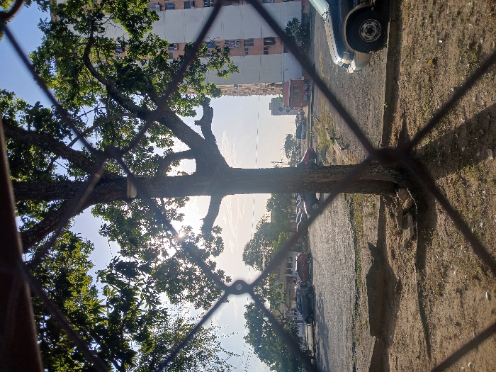 A tree trunk spans horizontally across the image, partly obscured by a chain-link fence. Leaves canopy the left side and top of the tree. The right side shows the tree rooted in dirt. A sidewalk runs parallel to the trunk, with cars parked along it. Buildings rise in the background. Sunlight filters through the leaves, creating a bright spot near the tree's center. The fence wire adds a geometric pattern to the view.