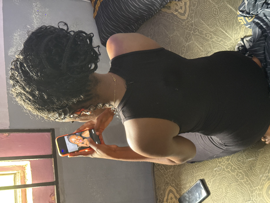 Location: Asipa, Nigeria. An individual is observed from behind, kneeling or sitting on a patterned mattress or mat. The individual has dark, textured hair styled in an updo and wears a dark, sleeveless garment. A thin gold-colored necklace with small accents is visible, along with a silver-colored hoop earring in the left ear. The individual holds an orange-cased smartphone with both hands, its screen displaying a photograph of a woman with dark skin, red lipstick, and dark hair, shown with pursed lips and an extended middle finger. A second, dark-colored smartphone lies face-up on the patterned mattress to the left of the primary individual. The setting features a light gray wall and a barred window on the left, through which sunlight enters. A dark blue and white patterned fabric is partially visible on the right side of the frame.