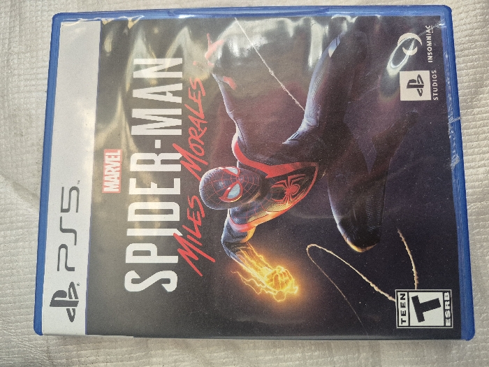 A PlayStation 5 game case displays the "Spider-Man: Miles Morales" title