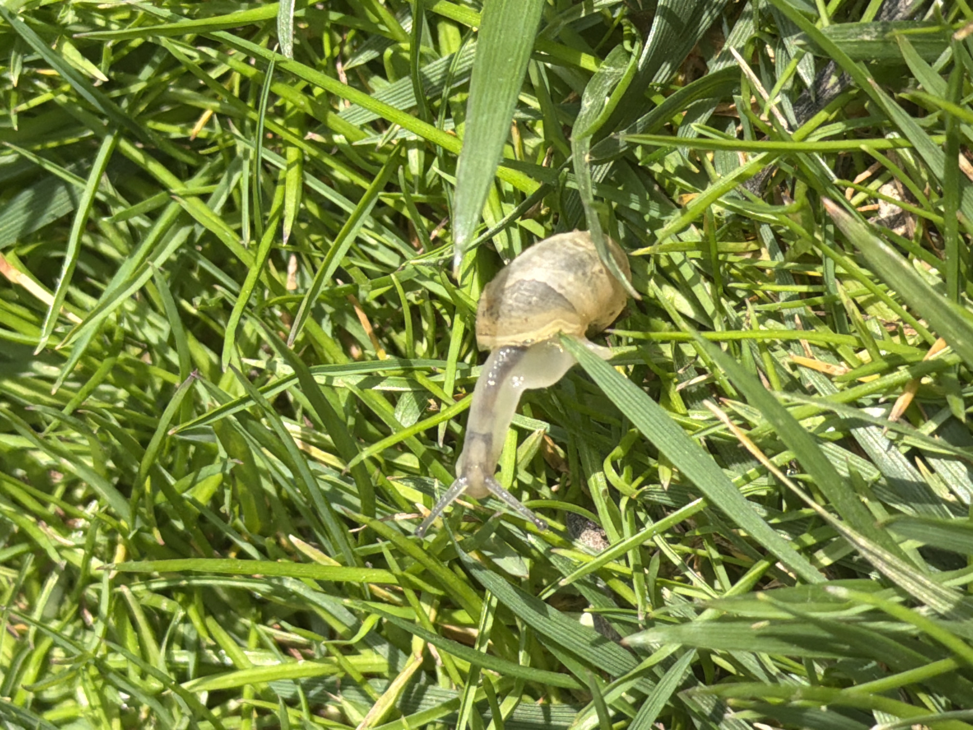 A snail with a tan and brown shell is crawling on blades of green grass. The snail's translucent body is visible extending from the shell. The environment consists of thick, green grass. The location is not discernible from the image. No people or interactions are visible.
