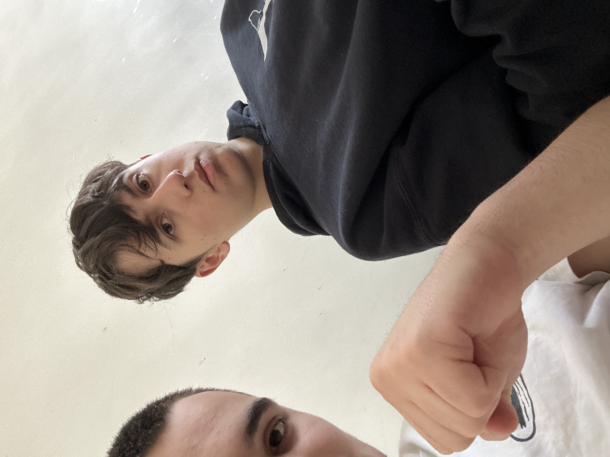 A low-angle, close-up photograph features two male subjects against a plain, off-white interior wall. The subject on the left, partially visible, shows the left side of his face, including his forehead and right eye, with dark, short hair. His right hand is clenched into a fist, positioned prominently in the lower-center foreground. He wears a white short-sleeved t-shirt with a dark graphic design partly obscured by his fist. The second subject, on the right, is a young male visible from the chest up, angled slightly towards the camera. He has medium-length, dark brown hair and a neutral facial expression with dark eyes. He wears a black hooded sweatshirt with a white graphic design on the front, possibly an abstract figure or animal silhouette. The background wall shows minor surface irregularities, including faint specks and smudges.