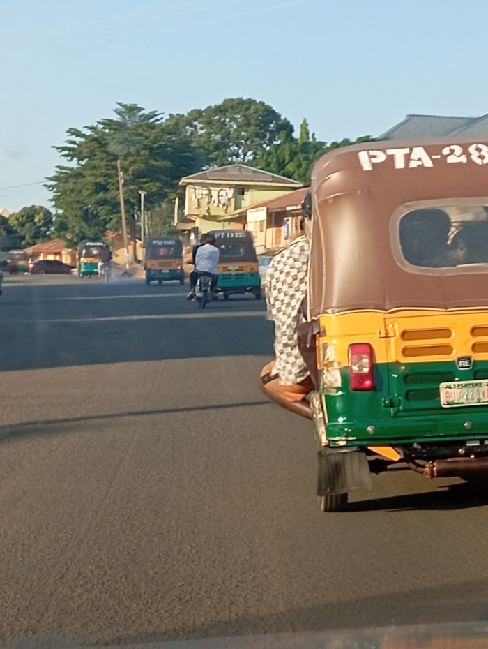 This image depicts a daylight street scene in Gwong, Nigeria, characterized by vehicle traffic