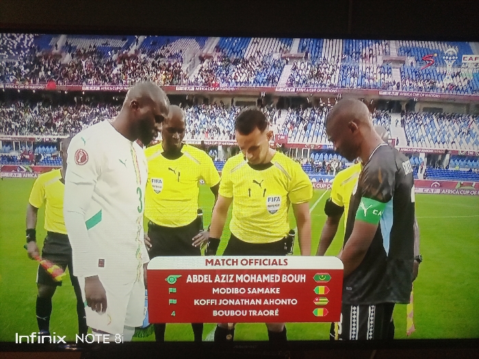The image displays a professional football match scene within a stadium, likely during the Africa Cup of Nations, based on visible branding. The specific city and location are unidentifiable within the image. On the illuminated green playing field, two football players and three match officials are standing. A male player on the left, with dark skin and a beard, wears a long-sleeved white jersey with green accents, displaying the number '3' and a circular emblem with a lion motif on the chest. He faces slightly right and downwards. A male player on the right, with dark skin and short hair, wears a short-sleeved black jersey with white trim, a green captain's armband on his left bicep, and patterned black shorts. He faces downwards. Between and slightly behind the players are three male match officials. The central official, positioned slightly forward, wears a yellow short-sleeved jersey with a black collar, black shorts, and black socks, displaying "FIFA" and "PUMA" logos. He is light-skinned and looks down. To his left and right are two other officials, both dark-skinned, wearing similar yellow short-sleeved jerseys and black shorts. One on the far left holds a red and yellow checkered flag. All officials appear to be looking downwards or straight ahead. In the background, tiered stadium seating, colored in alternating blue and white stripes, is partially filled with spectators. "CAF AFRICA CUP OF NATIONS" branding is visible in multiple locations within the stadium architecture and on digital hoardings. A "SuperSport" logo (S5) is also visible on a screen or board in the upper stadium. An overlay graphic in the lower center of the image displays "MATCH OFFICIALS" in white text on a red background. Below this, four names are listed with corresponding national flags and roles: - Abdel Aziz Mohamed Bouh (Mauritania flag, referee whistle icon) - Modibo Samake (Mali flag, linesman flag icon) - Koffi Jonathan Ahonto (Togo flag, linesman flag icon) - Boubou Traoré (Mali flag, number '4' for Fourth Official) The image exhibits some digital noise and a "Infinix NOTE 8i" watermark in the lower left corner, indicating it is a photograph of a screen displaying the broadcast.