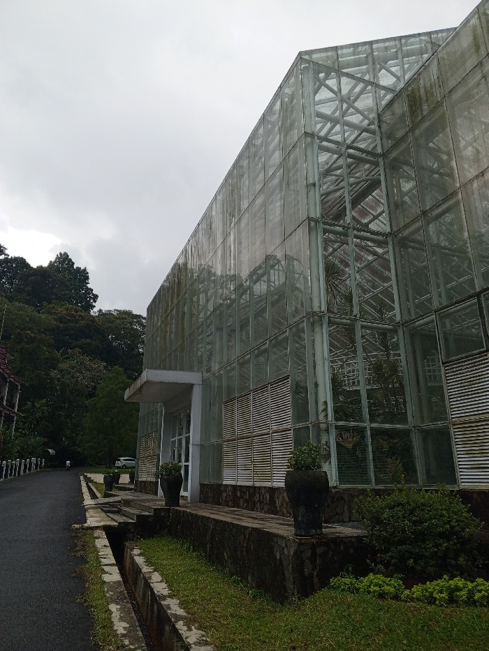 A large glass-walled structure dominates the scene, likely a greenhouse, reflecting the cloudy sky. Its framework is visible through the somewhat obscured glass, revealing an intricate interior. A short, concrete overhang shelters the entrance. A paved road runs alongside the building, lined with a low concrete barrier and some foliage. Tall trees form a dense backdrop, suggesting a location within a botanical garden or similar setting. Potted plants flank the entrance steps.