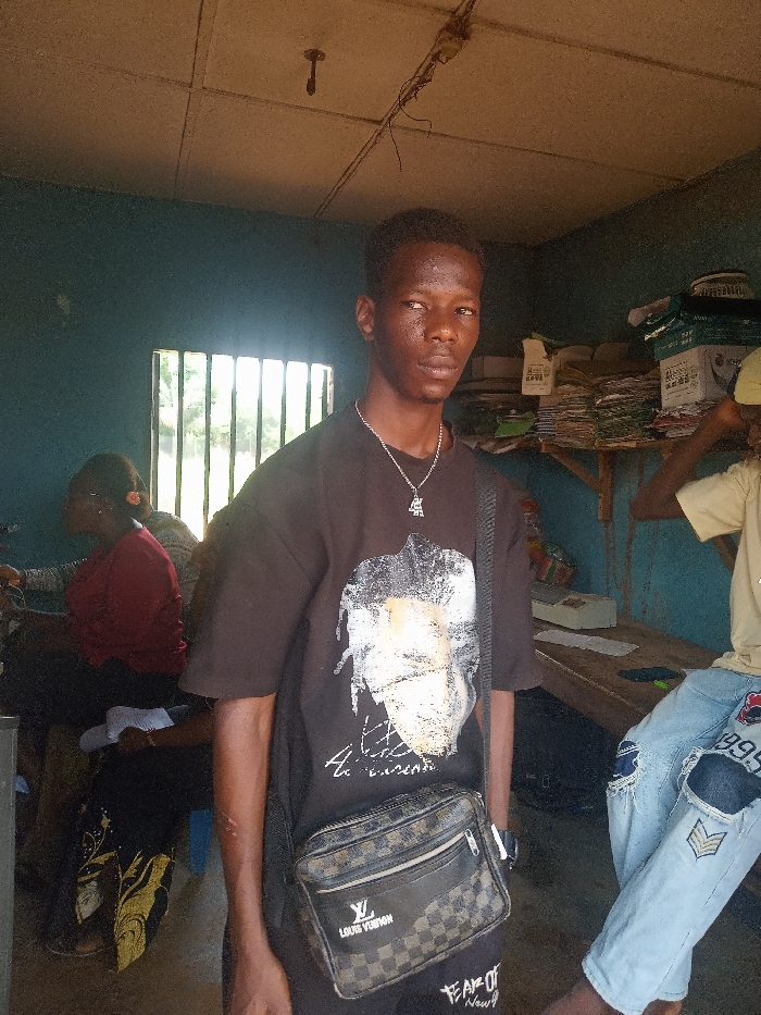 The image depicts an indoor scene confirmed to be located within Nsugbe, Nigeria. A young Black male stands centrally in the foreground, facing directly towards the viewer. He has short, dark hair and appears to have perspiration on his forehead. He is wearing a black oversized t-shirt featuring a large white and grey graphic print of a face on the front, a silver-colored chain with a pendant around his neck, and a brown and black checkered Louis Vuitton cross-body bag across his chest. A minor reddish mark is present on his left forearm. In the background, to the left, a window fitted with vertical metal bars is visible, allowing bright daylight to illuminate the interior and revealing green foliage outside. A person is seated near this window, partially visible from the back, wearing a red top and dark attire. To the right of the central figure, another individual is partially visible, seated on a wooden bench. This person is wearing light blue ripped jeans with distressed areas and patches, one displaying chevron insignia, and a light-colored t-shirt. Behind this seated individual, a wooden shelf unit is heavily laden with stacks of papers, folders, and a white scale or similar device. The room's walls are painted a dull blue-green, and the ceiling consists of light-colored panels, from which exposed wiring and a solitary ceiling hook protrude.