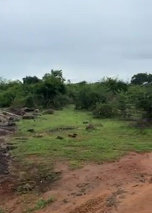 dirt road in a rural area on an overcast day. The road is reddish-brown and has tire tracks. On either side of the road is low-lying green vegetation and scattered trees. A rocky area is visible on the left side of the road. The sky is grey and cloudy.