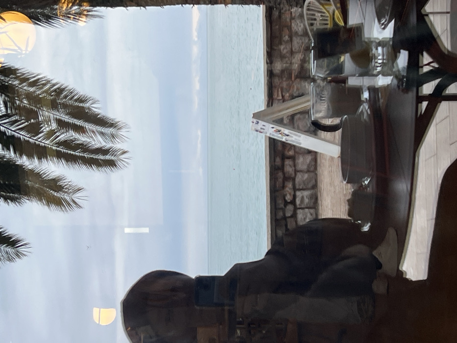 The image captures a view from inside a structure looking out through a glass window onto the waterfront in Rafailovići, Montenegro. In the immediate foreground, a dark-colored table displays a stack of plates or a bowl, a mug containing a dark liquid, a clear glass, and a small white object. A prominent reflection of a person, likely the photographer, is visible on the left side of the window, showing dark clothing, a smartphone held in hand, and white athletic shoes. Outside the window, a paved area is bordered by a low stone wall constructed of irregular grey blocks. A white A-frame sign with printed material is positioned on the paved area near the wall. The light blue-green Adriatic Sea extends horizontally across the midground to the horizon under an overcast sky. Distant land or low cloud formations are discernible along the horizon line. Palm fronds from an unseen tree partially obscure the upper portion of the view, and a segment of a palm tree trunk is visible on the far right. A small, faint red object, possibly a buoy, is present in the sea. A single bird is visible flying in the upper left quadrant of the sky.