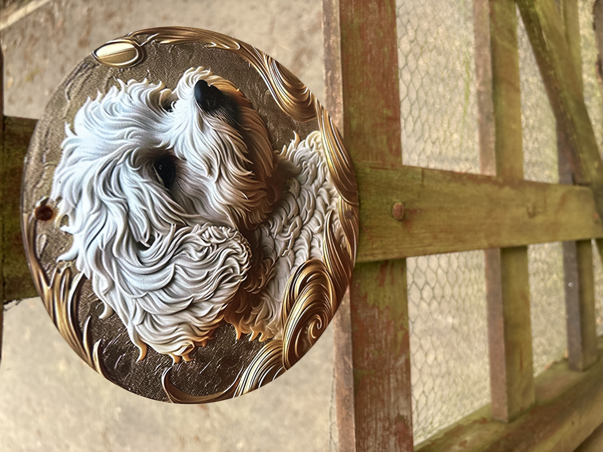A circular, relief-sculpted plaque depicting a white, fluffy dog's head and upper body is centered vertically. The dog, likely a Maltese or similar breed, faces slightly right, rendered with intricate detail in its fur. The plaque's background features textured bronze tones with gold-colored swirling decorative patterns. A small hole is visible at the top edge of the plaque. This plaque rests against a weathered wooden structure, appearing to be part of a fence or gate. The wooden structure consists of horizontal reddish-brown beams and a vertical post, all showing signs of weathering and some green discoloration. A nail head is visible in the vertical post. The blurred background above the wooden structure is a light-colored ground surface. Below the main horizontal wooden beam, a section of hexagonal wire mesh is visible, consistent with chicken wire, spanning horizontally above a blurred ground surface. The scene is located in Snailbeach, United Kingdom.