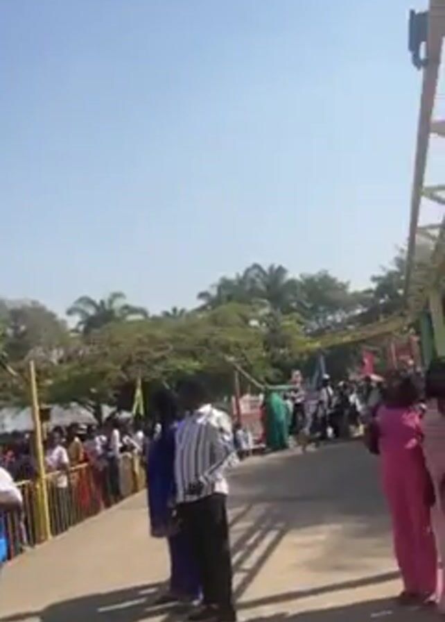 crowded amusement park with a tall, colorful tower ride as a focal point. People are lined up behind a yellow fence, presumably waiting for a ride. The weather appears to be sunny, with a clear blue sky. Lush green trees are scattered throughout the scene. People are diverse in age and attire. The video appears to be taken from a lower angle, looking up towards the ride and the sky.