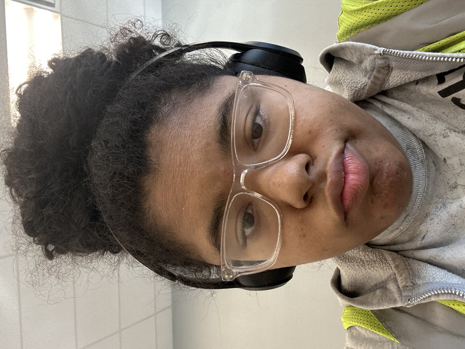 A person with dark curly hair pulled into a messy bun is seen in a selfie. They wear clear-framed glasses and black headphones. The individual has brown eyes and full lips. They are wearing a grey hoodie with neon green trim. The background consists of a white wall with subtle tile patterns and a light fixture visible at the top left. The image is slightly rotated, tilting the person's head to the side.