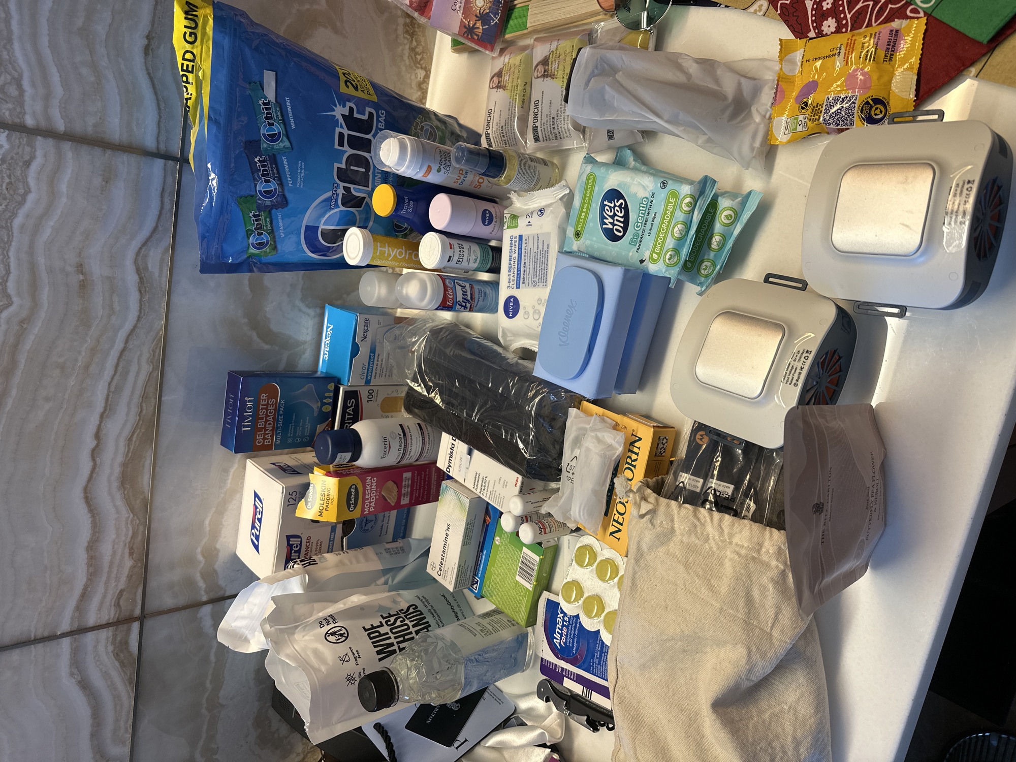 cluttered table surface covered with a variety of personal care, health, and convenience items. The table appears to be inside, possibly in a home. Visible objects include a bag of Orbit gum, various medications, bandages, wipes, moisturizers, sunscreen, Lysol To Go, Celestamine NS, Dymista D, NEOORIN, Almax Forte 1,5g, and a small travel bag containing additional items. The wipes present are Wet Ones Be Gentle, Kleenex. There are two small electrical devices with a square button in the center. The items are densely packed, obscuring much of the underlying table surface. The location could be inferred based on the presence of certain products commonly available in the United States, but there is no other contextual data present to precisely determine the city or region. The background shows a textured wall or floor, partially visible on the left side of the image.