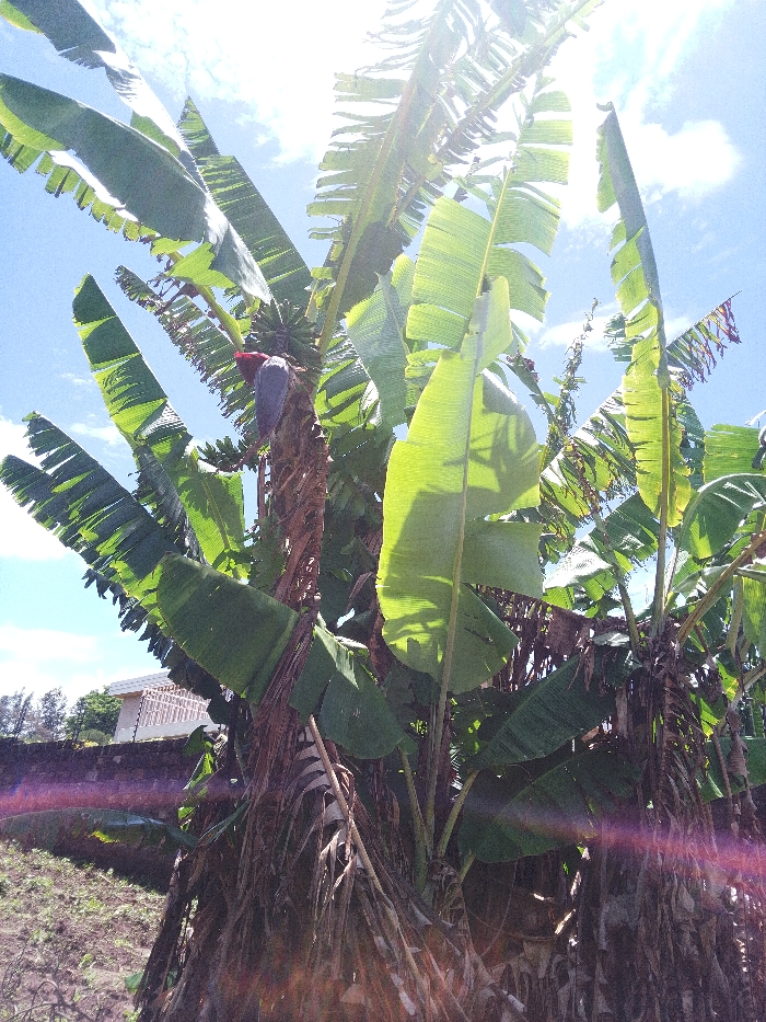 This image depicts a cluster of banana trees under a bright, sunny sky in Nachu ward, Kenya