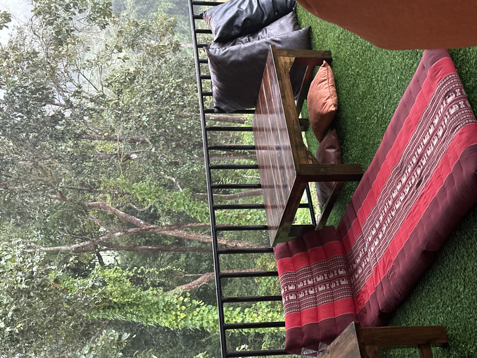 The image depicts an outdoor seating area, likely a balcony or elevated terrace, situated in Ban Paem Bok, Thailand, overlooking a dense, verdant forest