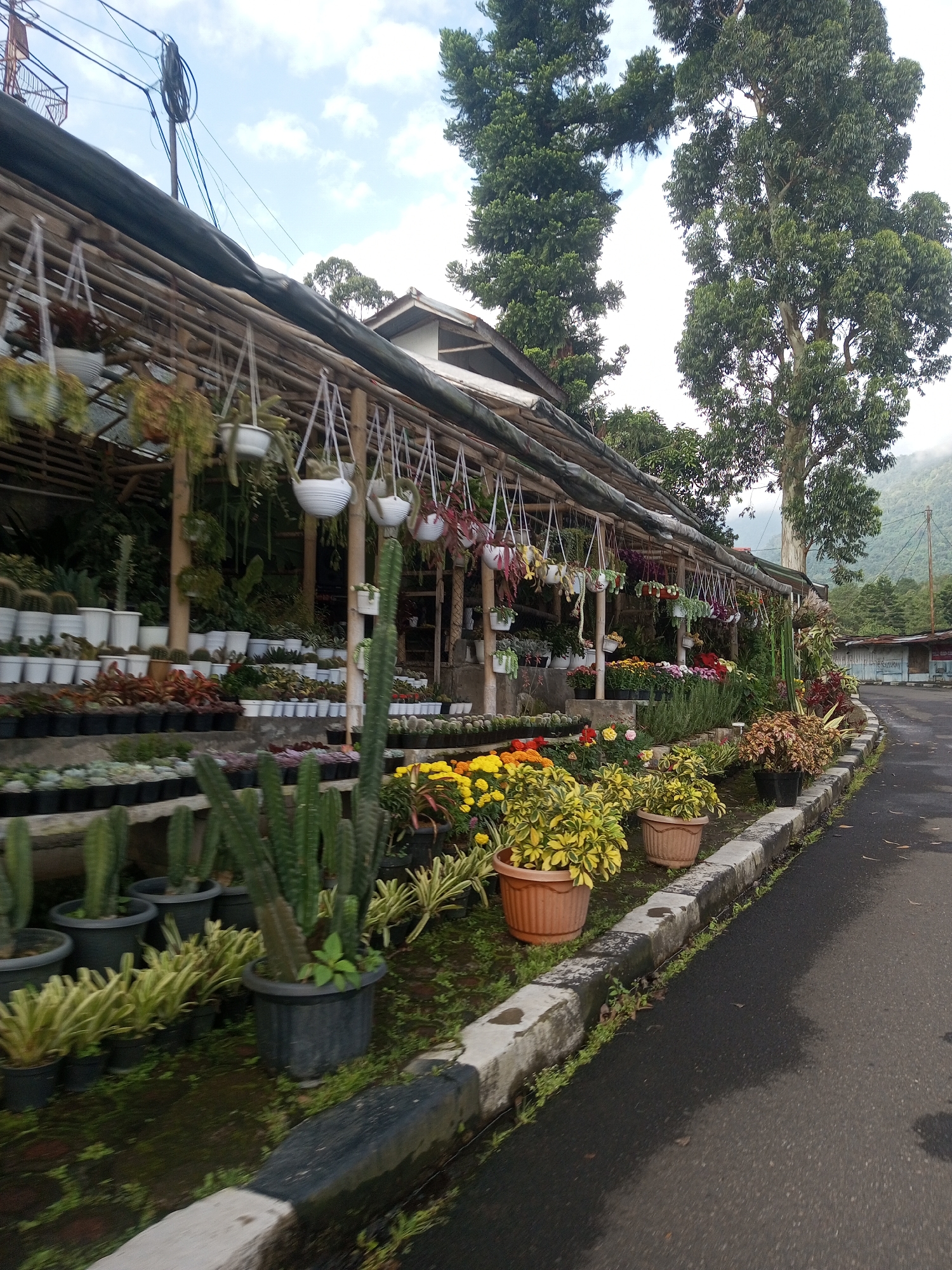 plant nursery along a paved road in Mya Sit Kaing Ywar Thit, Myanmar. The nursery is under a bamboo structure covered with a dark tarp, displaying various plants in pots and hanging baskets. Cacti, flowering plants, and foliage plants are visible. The road is wet and has a concrete curb bordering the nursery. In the background, trees and a building are present, and mountains are visible in the distance. There are no people visible in the image.