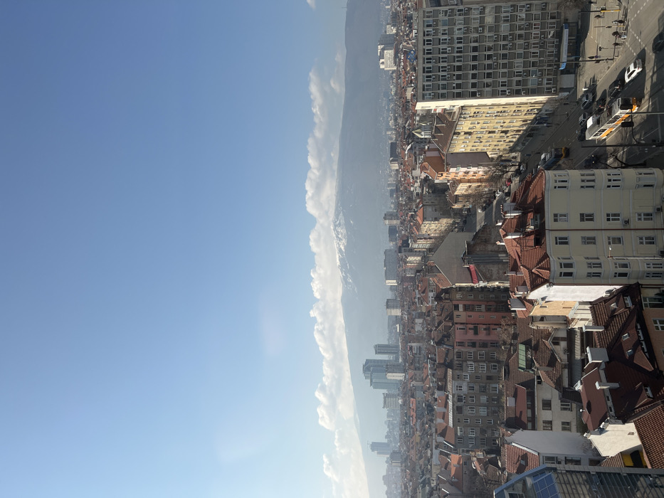 - "This elevated photograph depicts a broad view of Sofia, Bulgaria, under a clear, light blue sky with a band of white cumulus clouds at the distant horizon" by FM-wihp63, licensed under CC BY 4.0