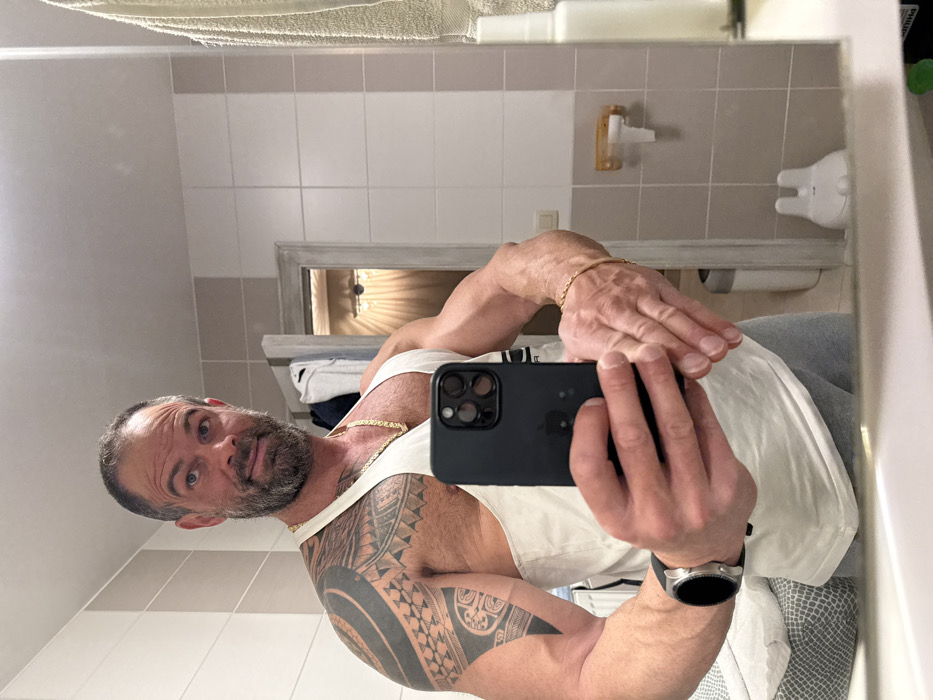 An adult male is captured in a mirror selfie taken inside a bathroom. The subject, appearing to be middle-aged, possesses a muscular build, a grey beard, and short, dark hair with a receding hairline. He wears a white tank top, a gold chain necklace, and light grey sweatpants. A prominent dark, tribal-style tattoo covers his left shoulder and upper arm. He has a silver-colored smartwatch on his left wrist and a thin gold-colored bracelet on his right wrist. The male holds a dark-colored smartphone, featuring a triple-lens camera array, in his right hand, directing it towards the mirror. He exhibits a subtle smirk while gazing slightly upwards. The reflected background reveals a bathroom with walls tiled in alternating horizontal bands of light grey/beige and white. An open doorway behind the subject's left shoulder reflects a brightly illuminated interior room featuring a wall-mounted light fixture. A white towel is draped over an object visible in this reflected doorway. To the right of the reflection, a white towel hangs on a bar, and a white spray bottle rests on the counter. Below, a wooden toilet paper holder with a roll of paper is mounted on the wall. A white, rabbit-shaped children's step stool or potty trainer is positioned on the floor. A white countertop surface is visible at the bottom of the frame. The specific location in Marche-en-Famenne, Belgium, is not discernible from the visual evidence presented.