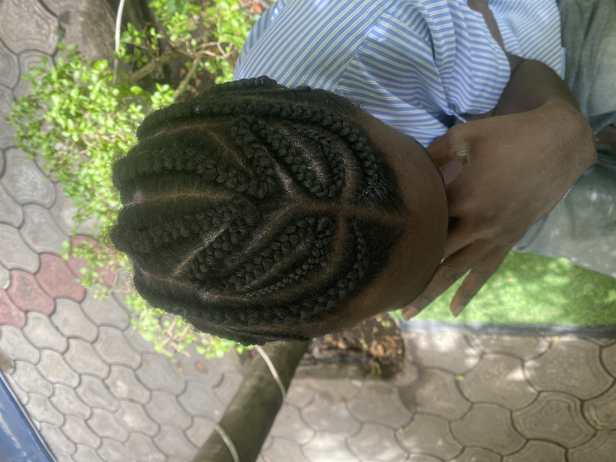 A close-up, high-angle shot captures the head of a person with meticulously styled braided hair, featuring a leaf-like design