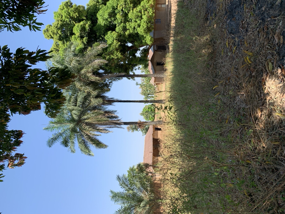 The image depicts a rural or semi-rural scene in Nandu, Nigeria, under a clear, bright blue sky