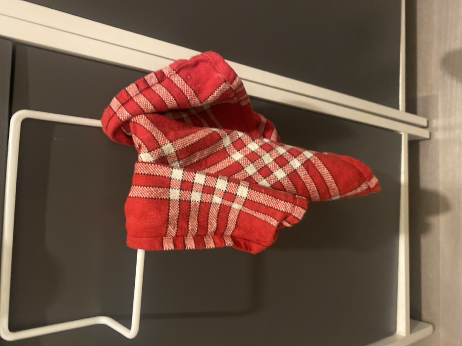 - "The image displays an indoor scene featuring a red and white plaid textile, identified as a kitchen towel, folded and draped over a white, U-shaped metal towel rack" by FM-dxreg2, licensed under CC BY 4.0