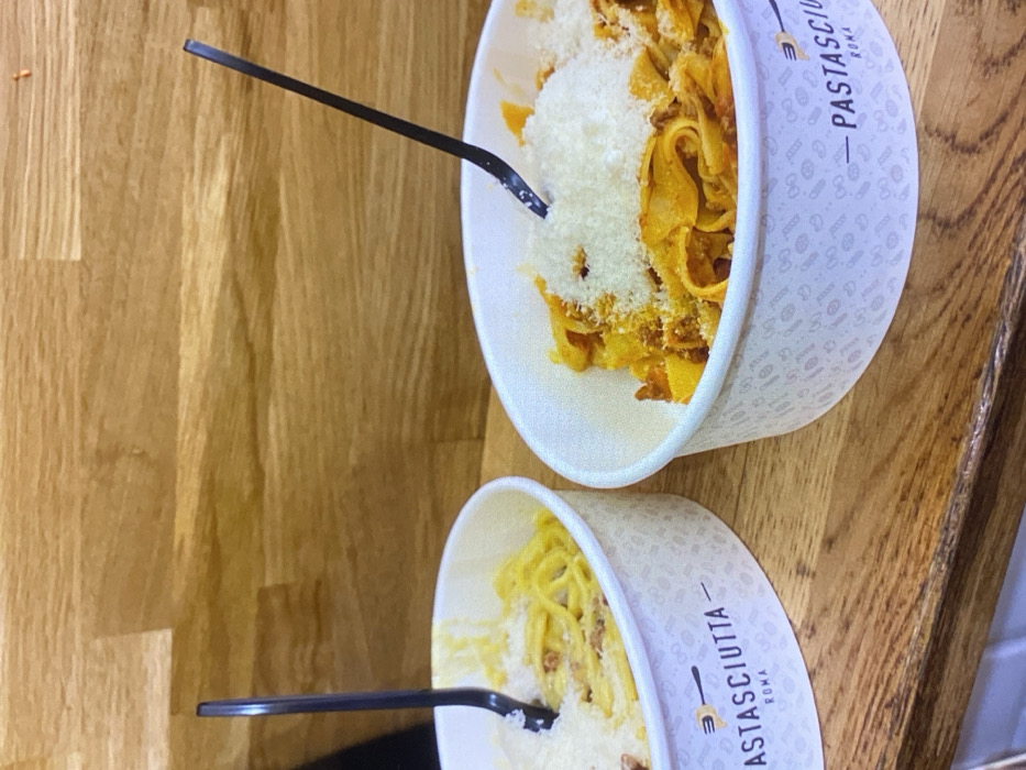 The scene is located in Unknown, Unknown. Two white disposable paper bowls containing pasta dishes are displayed on a light brown wooden countertop. The bowl on the left holds a yellow spaghetti-like pasta mixed with small pieces of meat and is generously topped with grated white cheese. A black plastic fork is inserted upright into this dish. The bowl on the right contains wider, flat, orange-colored pasta covered in a reddish-orange sauce, also crowned with grated white cheese. A second black plastic fork is similarly inserted upright into this dish. Both bowls are decorated with a repeating pattern and bear the text "PASTASCIUTTA" and "ROMA," accompanied by a stylized fork and knife logo. The background is composed of vertical light brown wooden paneling. No individuals are present.