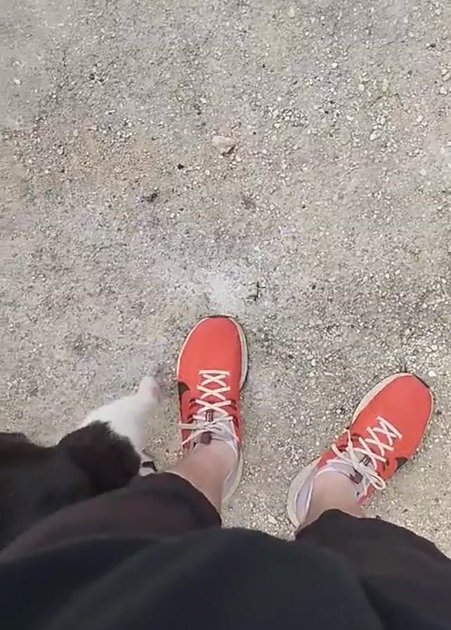 A person wearing red sneakers and black shorts is standing on a grey, speckled surface. A black cat with white markings is rubbing against their legs. The cat walks around the person’s feet, brushing up against their legs and sneakers. The cat is the primary focus of the video.
