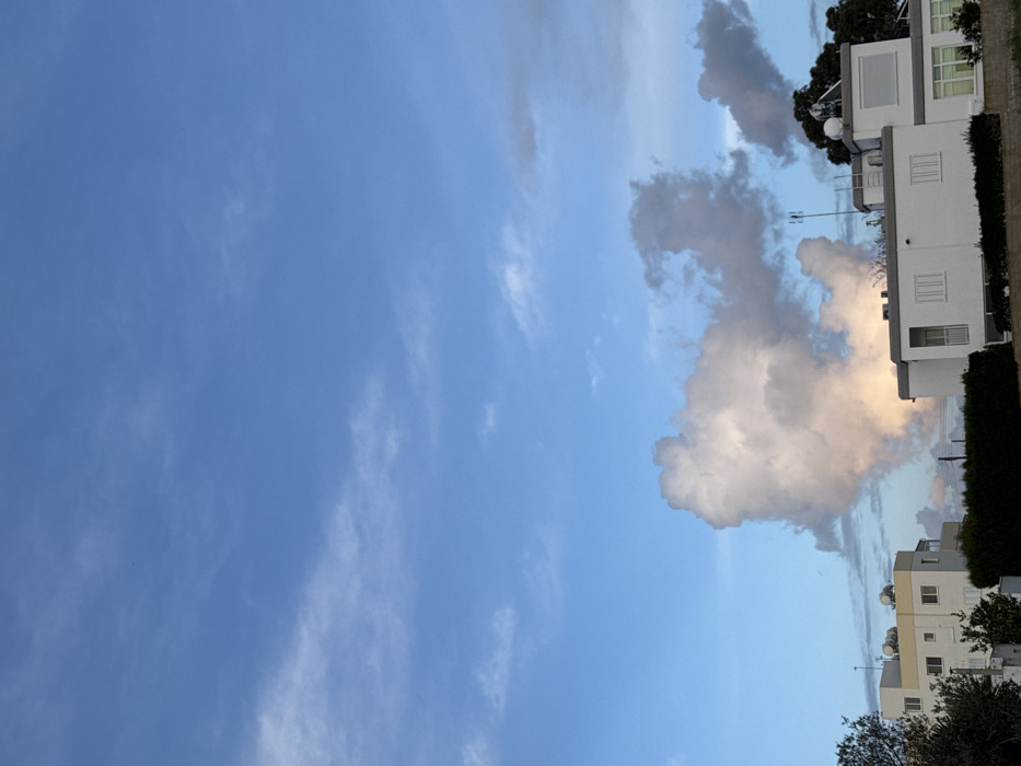 The image depicts an outdoor scene in Paralimni, Cyprus, under a partially cloudy sky. The upper two-thirds of the frame are dominated by a clear blue sky with scattered white cirrus and stratocumulus clouds. In the lower third, a prominent, large, light-colored cumulus cloud with warm, possibly sunset or sunrise-induced, orange and pink tones at its base rises from behind a row of structures. To the right of this large cloud, smaller, darker gray clouds are visible. The foreground features the tops of two multi-story buildings and vegetation. On the left, a light-beige or cream-colored building with multiple windows is visible. Its flat roof is equipped with several white satellite dishes and what appear to be water tanks or ventilation units. On the right, a white, two-story building with a flat roof is present. This building features rectangular windows with white frames and a small balcony with a gray railing. Its roof also hosts satellite dishes, antennas, and what might be air conditioning units. A dark green, trimmed hedge runs horizontally in front of the white building, partially obscuring its lower section. To the far left, dark green foliage from a tree or large bush is partially visible. To the far right, behind the white building, a cluster of dark green trees is visible against the sky. No people or active interactions are visible in the scene. The overall lighting suggests late afternoon or early morning.