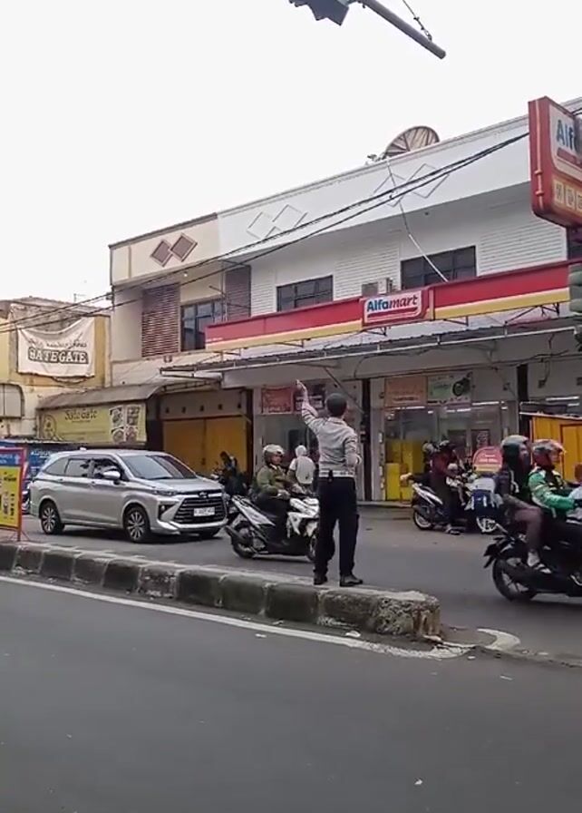 street scene in front of an Alfamart store. A traffic officer in uniform is standing on a curb, directing traffic. Cars and motorcycles are moving along the road. There are buildings and shops along the street. The sky is overcast.