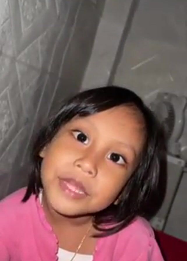 A young girl with dark hair, wearing a pink shirt and a gold necklace, is looking directly at the camera