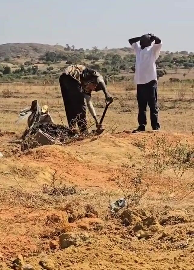two men in a dry, open field. One man, dressed in dark pants and a patterned shirt, is digging in the ground near a pile of debris that appears to be a vehicle wreck. The second man, wearing a white shirt and dark pants, stands a short distance away with his hands on his head. The landscape behind them is hilly with sparse vegetation under a clear, bright sky.