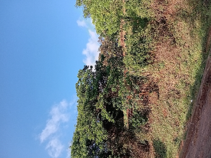 A bright blue sky with scattered white clouds fills the upper left. Green trees with dense foliage occupy the central and lower portions, transitioning into a mix of green and brown foliage towards the right. A low wall or embankment runs along the bottom edge of the frame. The composition appears to be a landscape view, possibly taken from a low angle.