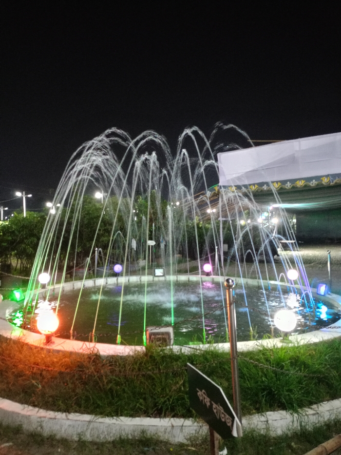 This nocturnal image depicts a large, circular water fountain illuminated by multicolored lights within an urban public space in Dhaka, Bangladesh