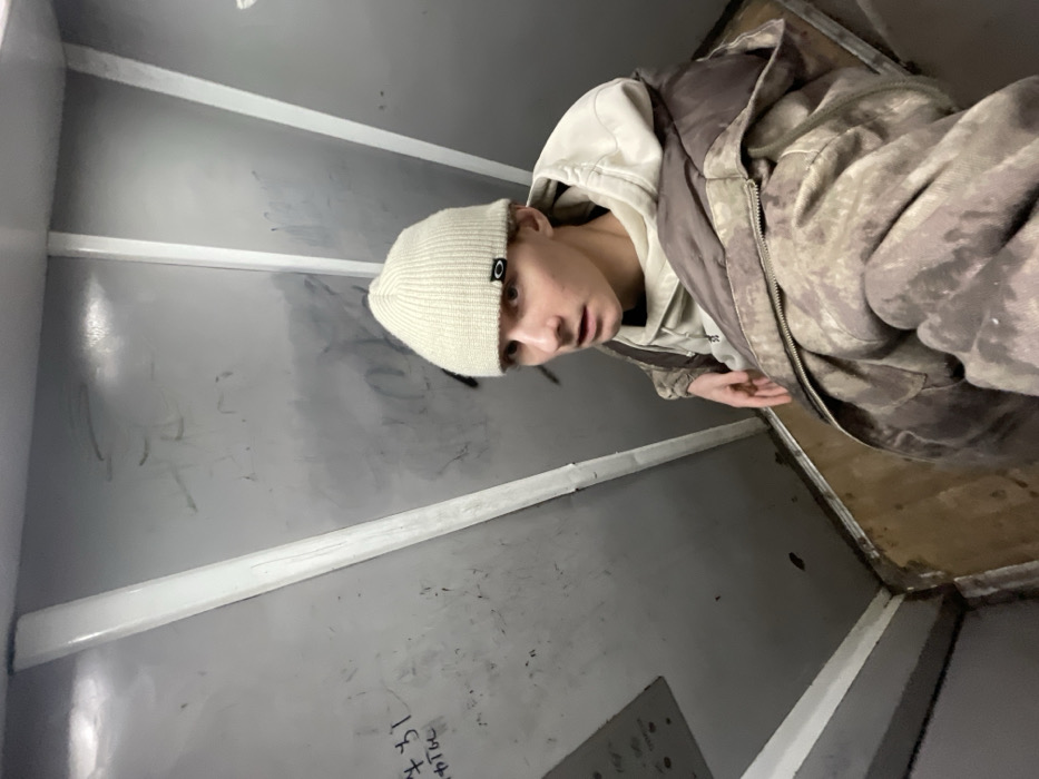 A young male is captured in a low-angle, eye-level perspective within an enclosed space, likely an elevator
