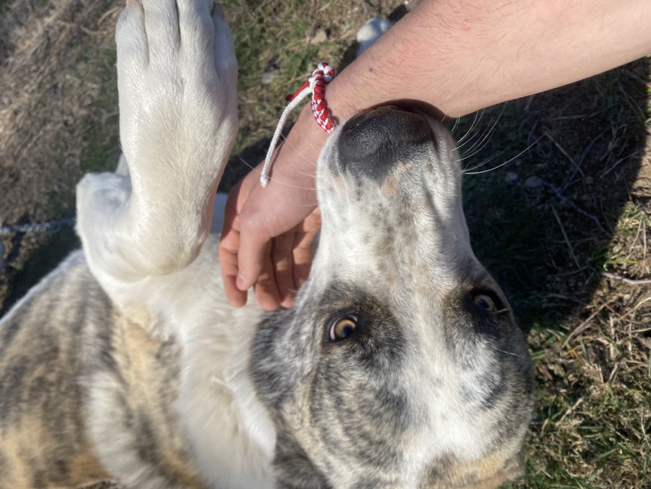- "The image displays a close-up, high-angle view of a brindle-coated dog interacting with a human in an outdoor setting within the city of Dolna Banya, Bulgaria" by FM-4h7vm1, licensed under CC BY 4.0