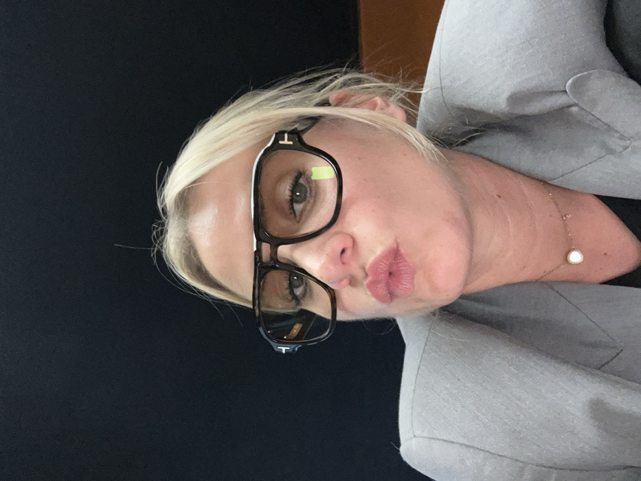 A close-up, eye-level frontal portrait depicts an adult female subject. The subject has fair skin, blonde hair, and light-colored eyes. She is wearing large, dark-framed, square-shaped glasses, identified by a "T" logo on the left temple and a small, light-green rectangular reflection or sticker on the lower-right lens. Her lips are pursed. Attire includes a light grey blazer over a dark garment, complemented by a gold-colored chain necklace featuring a circular white pendant and an additional small charm. The background is uniformly dark and out of focus, indicating an indoor setting with minimal environmental detail, transitioning from black in the upper frame to a faint brownish hue on the lower right. No visual cues within the image confirm the specified location of Saint-Médard-en-Forez, France.