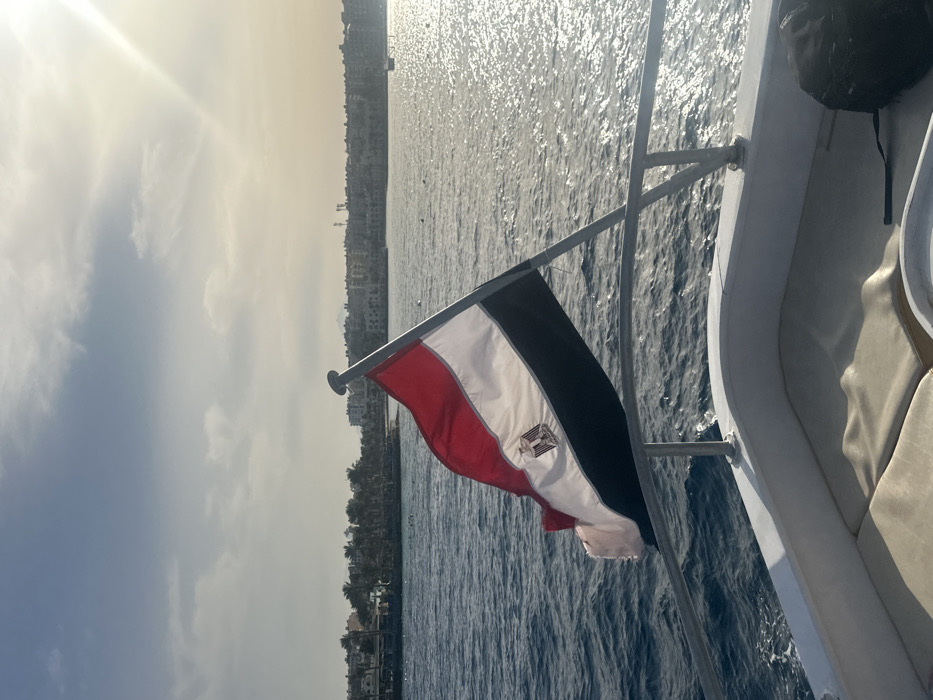 The image presents a maritime scene captured from the stern of a vessel, looking towards the coastline of Hurghada, Egypt