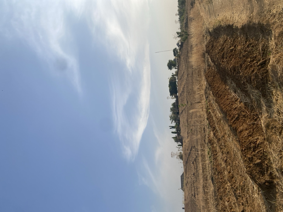 A vibrant blue sky dotted with wispy clouds dominates the left portion of the scene. Transitioning to the right, a field of dry, brown soil stretches out, marked with parallel furrows. A sparse line of trees and vegetation punctuates the horizon, offering a slight contrast to the monochromatic landscape. A tall communication tower is visible in the distance. The overall impression is one of open space under a clear sky, juxtaposed against the barren earth.