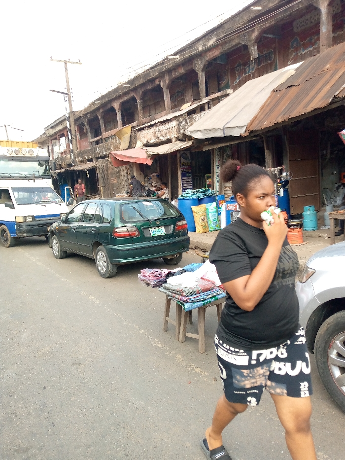 The image displays a daytime street scene in a commercial district of Aba, Nigeria
