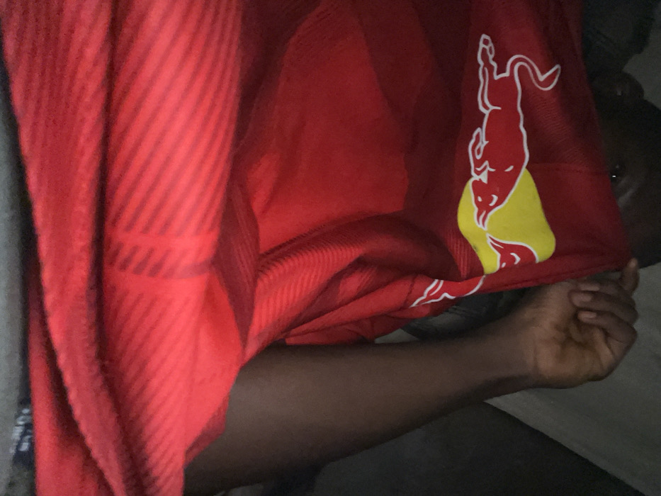 A dark-skinned person holds a red and yellow shirt with a Red Bull logo. The shirt is draped and partially obscures the person's face, with only an eye visible. The shirt has a subtle stripe pattern. The person's hand is holding the edge of the shirt. The background is dark.