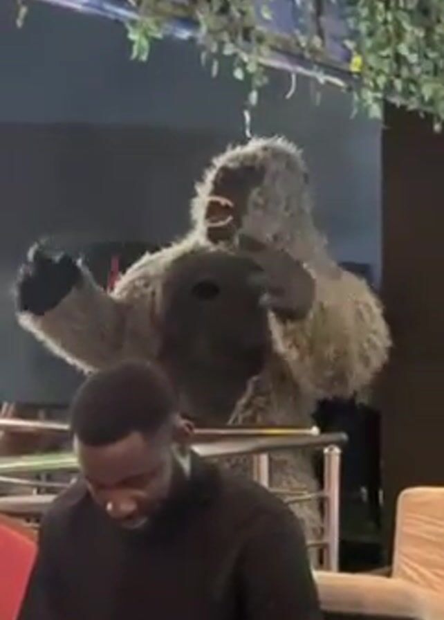 man seated at a table, looking down at something, while a person in a gorilla suit stands behind him. The gorilla suit is gray and black with a menacing expression. The room appears to be indoors with decorations like hanging vines. There is a chrome railing nearby. The seated man is wearing a black shirt. The scene's purpose is unclear.