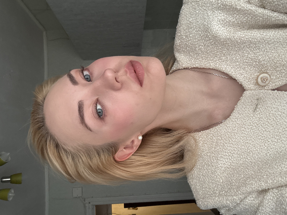 A blonde female, with light skin, blue eyes, and visible makeup, is depicted in a chest-up portrait. She wears a small white pearl stud earring in her left ear and a thin, silver-colored chain necklace. Her attire includes an off-white, textured jacket, possibly tweed, with a decorative white and gold-toned button at the front closure. Her head is slightly tilted, and her gaze is directed towards the viewer. The background reveals an indoor setting with light-colored walls showing minor imperfections. To the upper left, a darker doorway is partially visible. To the upper right, a light-colored cabinet or utility structure is present. Overhead, two pendant light fixtures with green-toned shades are partially visible against a light ceiling. The scene is located in the city of Chaikovsky, Russia.
