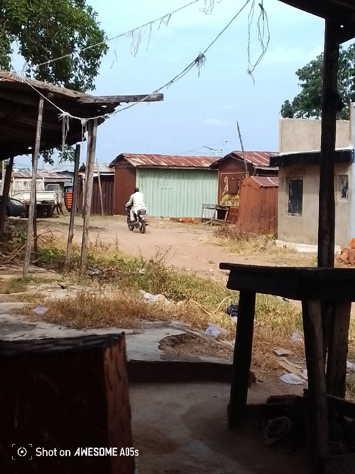 The scene depicts a dirt road environment in Adankolo, Nigeria, under an overcast sky. In the midground, a lone individual wearing a light-colored long-sleeved garment is riding a dark-colored motorcycle away from the viewer, moving towards the distant structures. The road is unpaved, with patches of dry, sparse vegetation and scattered debris visible on either side. To the left of the road, a white pickup truck is partially visible, parked, with a second individual indistinctly present nearby. The background is dominated by various single-story structures constructed from corrugated metal sheets, some appearing rusted reddish-brown and one featuring a lighter green panel. One reddish-brown structure displays faded painted text or graphics. Further right in the background, a light-colored, possibly stucco or concrete, building with dark rectangular openings is visible. In the immediate foreground, to the right, a dark wooden table-like structure is partially visible. To the left foreground, a makeshift shelter with a wooden frame and corrugated metal roofing stands. Overhead, several tattered and loosely strung wires or ropes traverse the scene. Trees are visible in the upper left and upper right corners, framing the sky. The overall environment appears rustic and utilitarian.