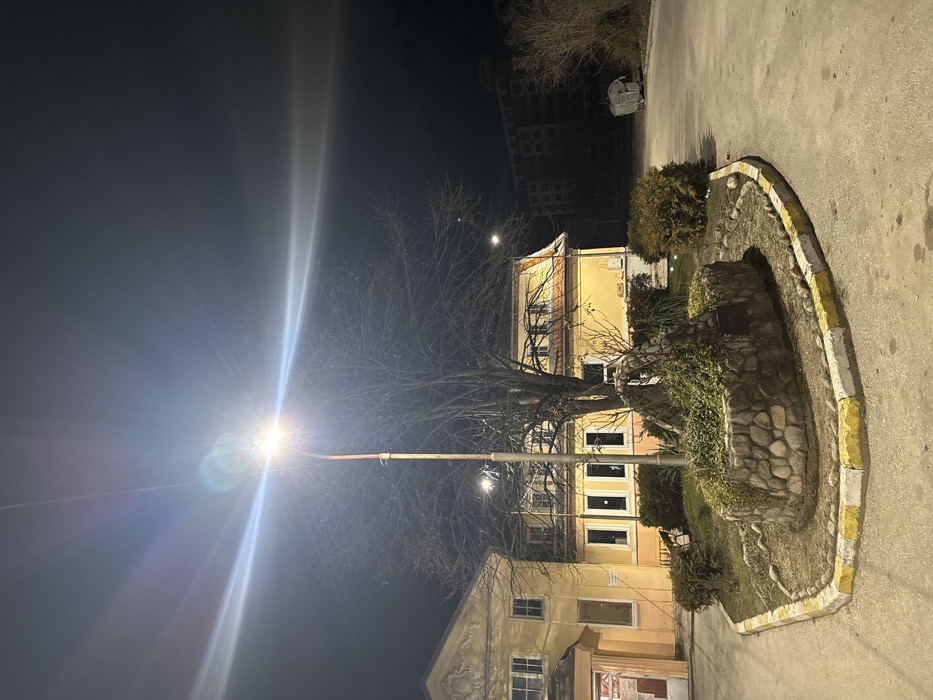 This image depicts a nighttime street scene in Velingrad, Bulgaria. A prominent street light, centrally positioned on a pole, illuminates the foreground and midground, causing significant lens flare. A large, bare deciduous tree stands behind the light pole, situated within a curbed median. The median features a circular stone planter containing green foliage and dry branches, bordered by a curb painted white and yellow. To the left, a two-story light yellow building with classical architectural details around its windows and a reddish entrance structure is visible. Behind the tree, another two-story light yellow building with a red-tiled hip roof and dormer windows is present, displaying scaffolding on its facade. The ground consists of asphalt pavement. In the distant background to the right, a dark, multi-story building and a large grey communal waste bin are partially visible through sparse, dry vegetation under a dark night sky. No individuals are present in the scene.