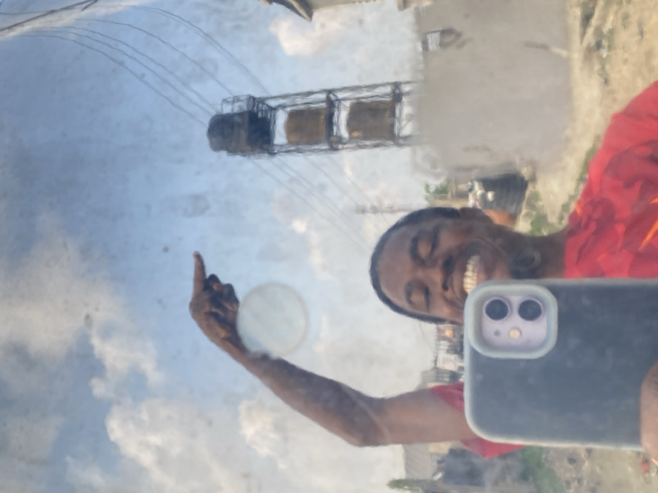 A mirrored selfie shows a smiling individual in a red shirt holding up their middle finger while holding a smartphone. The reflection reveals a sunny sky with clouds, power lines, and a building or structure resembling a water tower. The focus is soft, and the mirror appears slightly dirty, creating a diffused effect. The scene is outdoors, likely during the daytime.