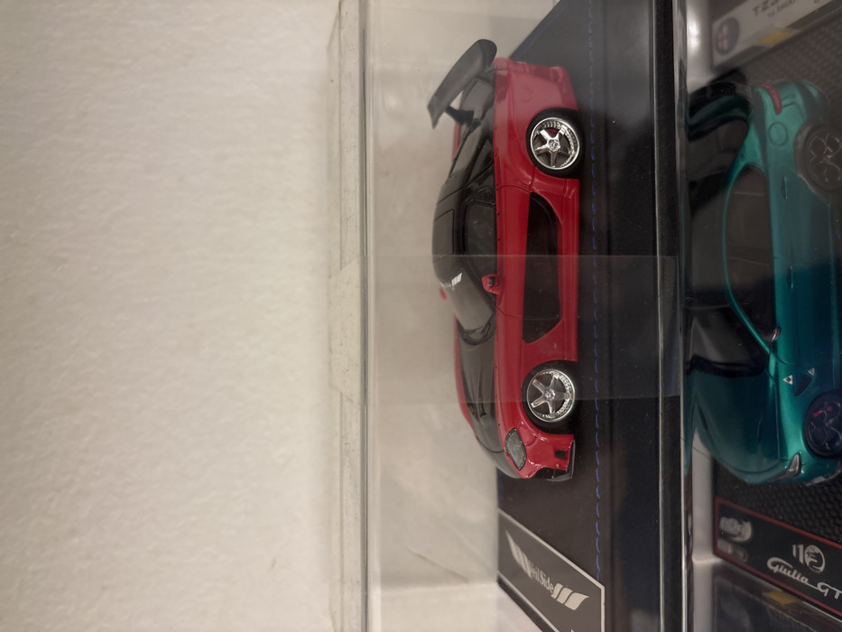 The image depicts an indoor scene within the Kajang Municipal Council, Malaysia, showcasing two miniature model cars displayed in clear protective cases. The primary subject, occupying the upper two-thirds of the frame, is a highly detailed 1:64 scale model of a red sports car, resembling a heavily modified Mazda RX-7. The car features a red body with a matte black hood and roof. It exhibits a widebody kit, aggressive front bumper, prominent side skirts with visible air ducts, a large rear spoiler, and chrome multi-spoke wheels with low-profile tires and noticeable negative camber. This model rests on a dark blue base with white stitching, which includes a rectangular black section on the left displaying a white logo, partially obscured but resembling "MINIGT". The entire upper model and its base are enclosed within a transparent rectangular plastic display case. Below this, partially visible in the bottom third of the image, is another miniature model car, a teal or dark green four-door sedan, identifiable as an Alfa Romeo Giulia, also within a clear display case. This model features black multi-spoke wheels. A partially visible label on its base reads "Giulia GT". The background consists of a plain, light-colored (off-white) textured wall directly behind the upper display case. No people are visible. The scene suggests a static collection display.