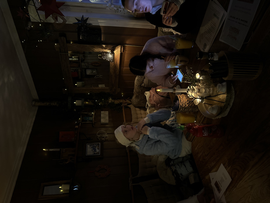 A dimly lit room features three individuals sitting around a table. One person in a blue outfit and white head covering sits on a cushion. Another person wearing pink uses a phone. The third person wears black and also uses a phone. A table holds glasses, a pineapple, and a drink container. The interior has dark wood paneling and Christmas decorations. A menu is visible on the table.