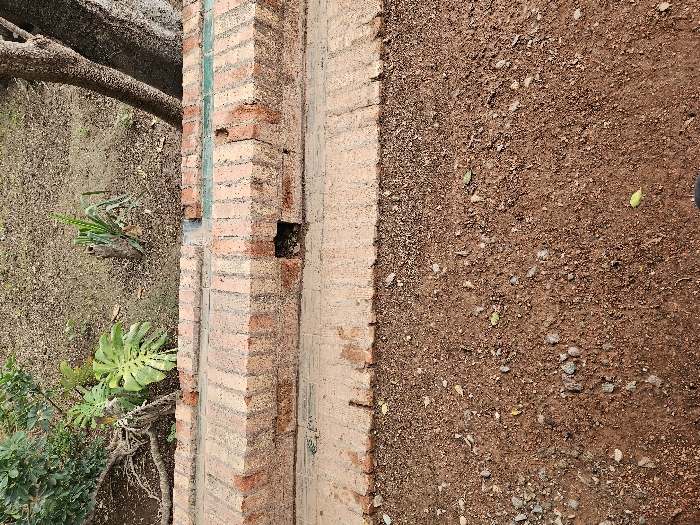 The image displays an outdoor scene in Marrakesh, Morocco, viewed from an elevated perspective looking downward, featuring a weathered brick barrier separating two distinct ground levels. The immediate foreground shows a reddish-brown, granular soil surface, interspersed with numerous small grey pebbles and scattered, dried light green leaves. Immediately beyond this, a low brick wall or railing extends horizontally across the frame. This structure is composed of a reddish-brown, flat base topped by two courses of reddish-orange bricks. A rectangular void, approximately one brick wide and half a brick high, is present in the lower brick course, positioned slightly left of the image center. The interior of this void appears dark and contains visible debris. Along the uppermost edge of the brickwork, faint and intermittent patches of a faded teal-colored material are discernible. The background, situated beyond the brick barrier, reveals a drier, lighter brown soil landscape with sparse ground cover. Specific botanical elements include a dense cluster of dark green foliage with exposed roots on the far left. Near the center-left, a large, distinctively deeply lobed green leaf is visible. Towards the center-right, an upright plant with several strap-like green leaves is present. The rough, greyish-brown bark of a mature tree trunk occupies the far right portion of the background. No individuals, animals, or active subjects are depicted within the scene.